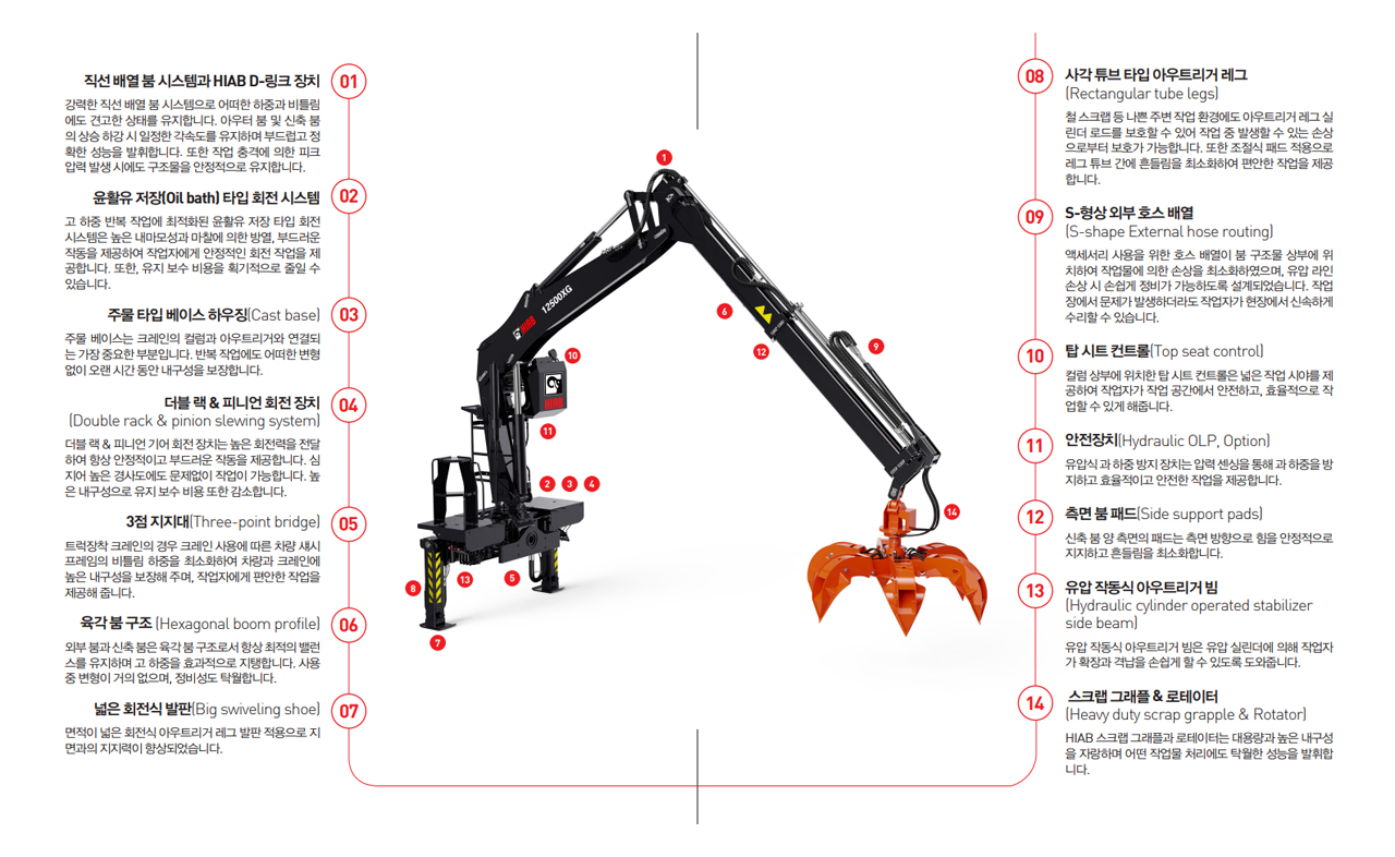 구분크레인능력(tm)최대작업반경(m)인양능력(m/kg)정격압력(bar)정격유량(ℓ/min)회전각도(°)회전속도(°/sec)오일탱크용량(ℓ)그래플용량(㎥)자중 O/R제외(kg)장착차량(ton)